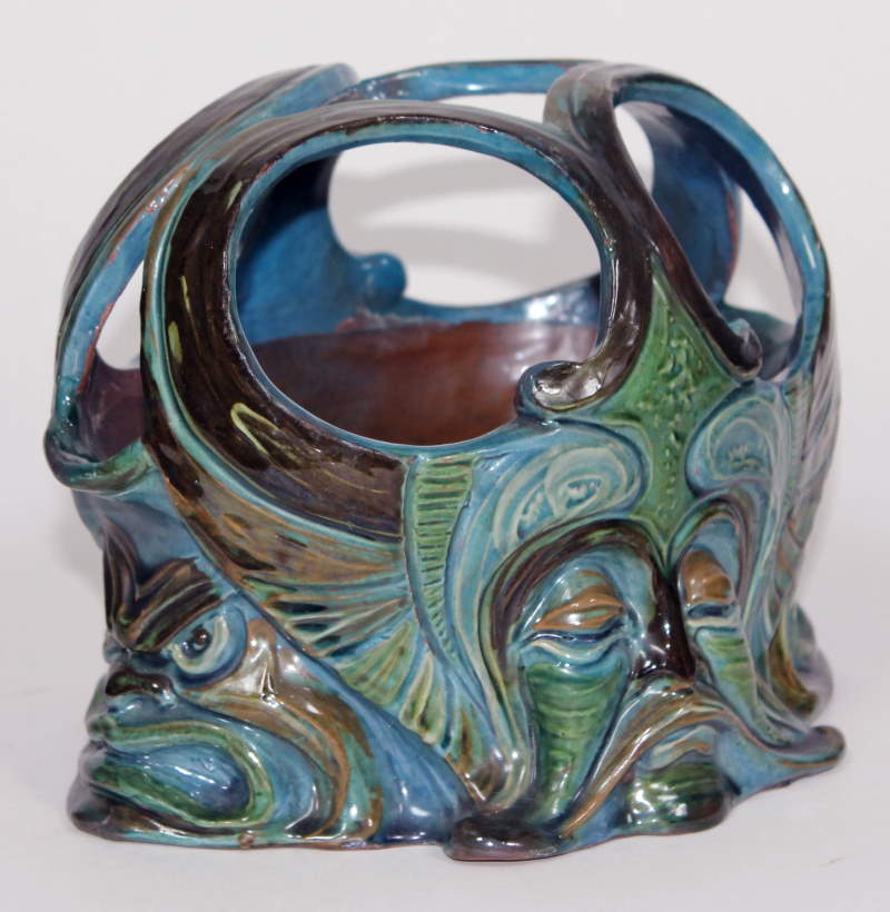 The pottery created was influenced the range of movements from the late 1800s to the 1930s – the Aesthetic Movement, Art Deco and Art Nouveau. As well as vases, ewers and plates they also created interesting pieces grotesque wall pockets, and figural  money boxes and candleholders.