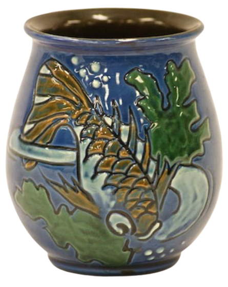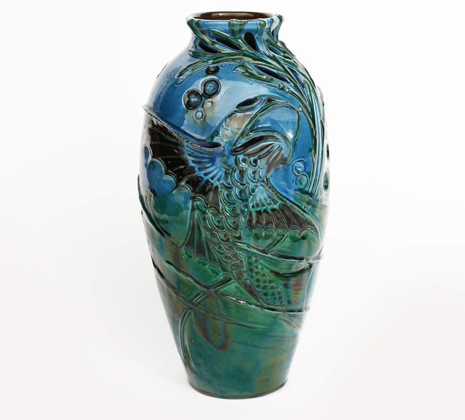 An Art Nouveau C H Brannam vase by Frederick Braddon, dated 1910, slender, shouldered form, pieced and modelled in low relief with a scaly fish in turbulent water, in shades of green and black on a blue ground, incised C H Brannam, Barum, 1910, FB, PFM paper label, 39cm. high. Sold for £1,000 at Woolley & Wallis, August 2021.