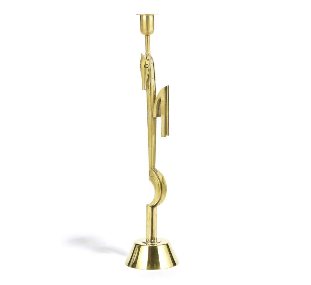 Hagenauer Werkstätten (Austrian, active 1898-1987). A Figural Candle Holder, designed introduced circa 1928 cast and polished brass, the column modelled as a stylised rearing horse 39.5cm high, stamped ‘WHW/HAGENAUER WIEN/MADE IN AUSTRIA’. Sold for £1,100 at Bonhams, August 2020.