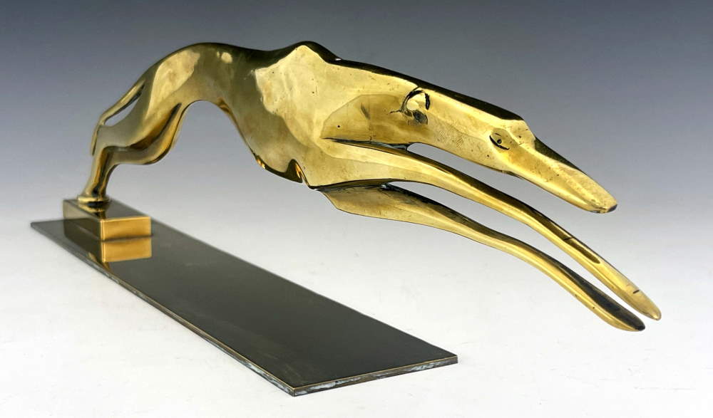 Karl Hagenauer, an Art Deco brass figure of a leaping greyhound, circa 1930s. Sold for £2,400 at Kinghams Auctioneers, October 2022.