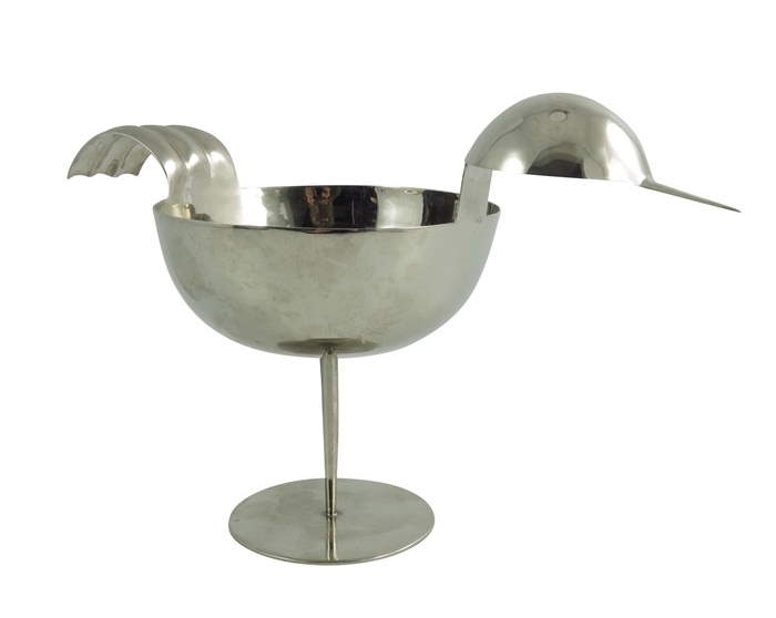 Karl Hagenauer, an Austrian nickel plated bird bowl, after 1927, pedestal form, stamped marks, 17cm high, 27.5cm long. Sold for £1,500 at Kingham & Orme, October 2019.