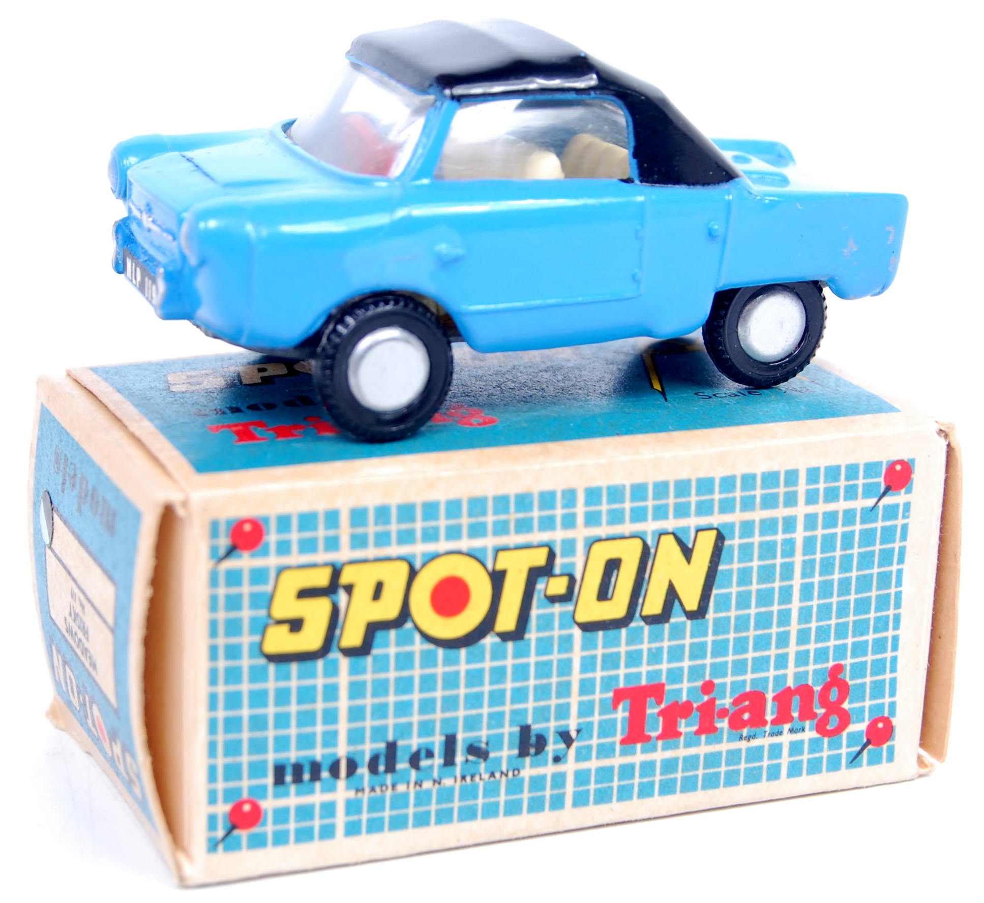 Early Spot-On models stated “Made in the United Kingdom” on the base, but later models, changed to “Made in Northern Ireland”. The first packaging for Spot-On die-cast vehicles was a box in light blue with draughting compass ‘dividers’ and ‘graph paper’-like grid printed on it, as well as the standard yellow and black lettering. The appearance of the designs suggested that they were not only toys, but also finely engineered components. The second series of boxes was similar, however the ‘dividers’ were considerably reduced and an image of the automobile (which was not featured on the first boxes) was added. The final boxes in the late 1960s were black and blue with cellophane windows, which are thought to be some of the first window boxes available.