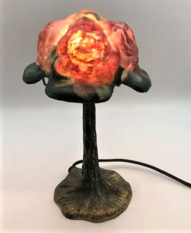 One of the most recognisable and enduring designs is the “Rose Bouquet” model, with its brilliant pink blossoms in high relief. Popular when first introduced, it remains highly collectable today. Other designs, such as hummingbird and chrysanthemum combinations, demonstrate Pairpoint’s flair for naturalistic yet decorative composition.