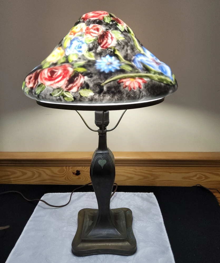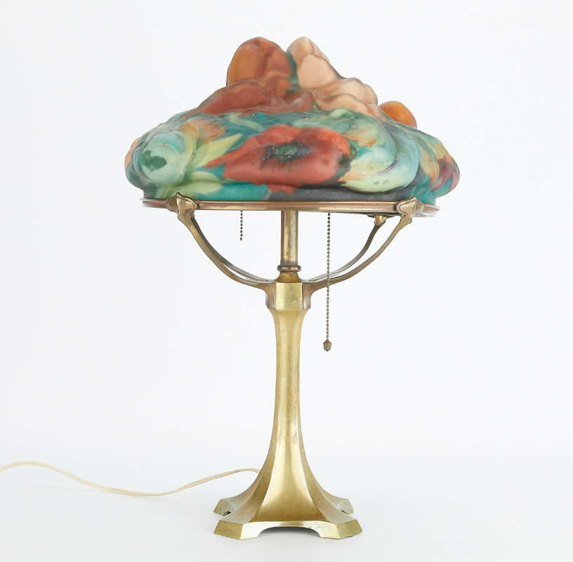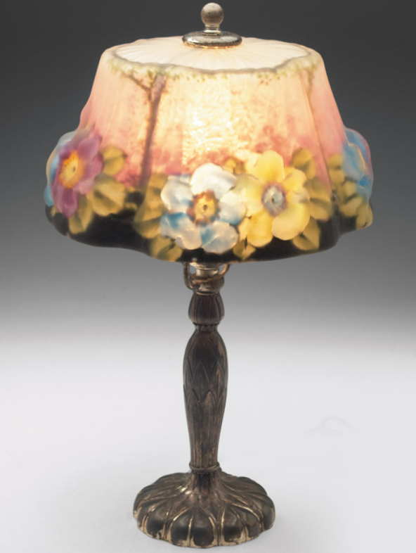 Unlike the mosaic construction of Tiffany lamps, Pairpoint Puffies were created from blown glass moulded in high relief, with floral designs formed directly into the surface of the shade. The decoration was then hand-painted on the inside of the glass, allowing the colour to glow warmly when illuminated. This interior painting technique created remarkable depth and richness, while also protecting the surface design.