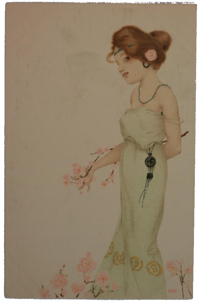 Raphaël Kirchner produced over a thousand published paintings and drawings in his lifetime, mostly in the form of picture postcards. His postcards are very sort after with collectors, from his orientalist Geisha series which had influences of Art Nouveau, East and West, to his ephemeral beauties from La Vie Parisienne to the more realistic erotic young ladies who were the favourites of the European and American soldiers in the Great War who pinned his cards up in the trenches.