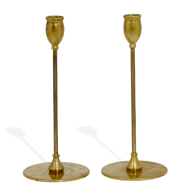 Robert R. Jarvie, whose early advertisements label him “the Candlestick Maker,” created some of the most sophisticated metal candlesticks of the Arts and Crafts period, naming each design with a letter of the Greek alphabet.