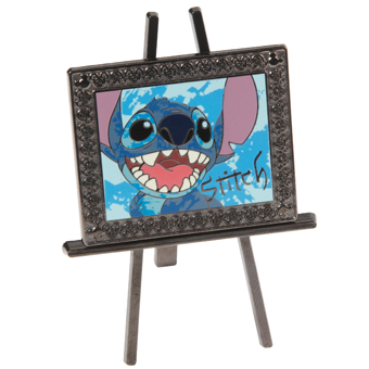 The first two pins in the series are Oil Painting Stitch featuring Stitch in a blue background and includes an easel which allows it to be stood upright and Oil Paining Goofy featuring Goofy in an orange background and includes an easel which allows it to be stood upright.