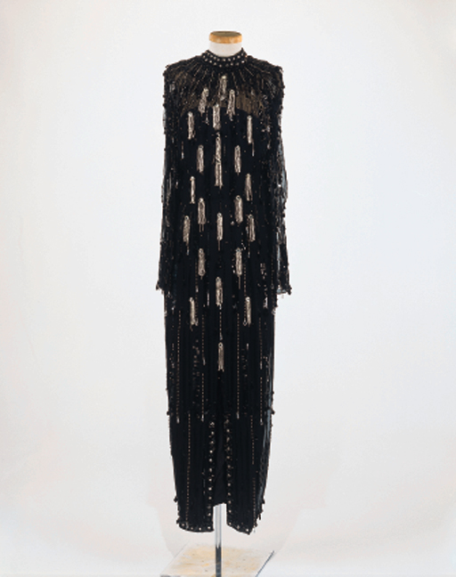 heres lucy dressPictured left: HERE’S LUCY, 1968-1974  Lucille Carter’s exquisite full-length black formal gown covered with large dangling rhinestones, intricately ornate black beading and black diamond shaped celluloid ornamentation as worn by comedian Lucille Ball on an episode of Here’s Lucy. Acquired from daughter Lucie Arnaz. Accompanied by a glamourous color photograph of Lucille Ball largely autographed, “Love, Lucy”.-8 x 10 in. Sold for $2,115 at Christies Century of Hollywood Sale, New York, 2000. Image Copyright Christies.