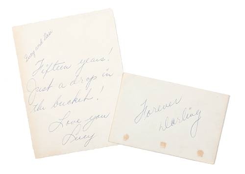 lucille ball documentsPictured right: Lucille Ball documents including  4 Autograph Letters Signed (“Lucy” and “Lucille Ball”), 9 pp, 4to and 8vo, n.p., n.d., to Eddie Mannix, George Cukor, and Desi Arnaz, on personal stationery, light toning. The note to Arnaz reads: “Fifteen years! Just a drop in the bucket! / Love you / Lucy.” Present is its original autograph envelope reading Forever Darling, the name of the movie Lucy and Desi starred in in 1956, during their 15th year of marriage. Other typed letters and photographs. Sold for $2,440 at Bonhams, 2011. Image Copyright Bonhams.
