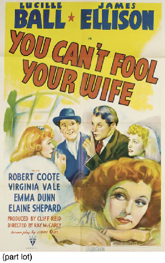 Pictured right: LUCILLE BALL POSTERS A large lot of posters from Lucille Balls films including: a complete set of lobby cards from “Annabel Takes a Tour” (1938, RKO), 5 lobby cards from “Beauty for the Asking” (1939, RKO), 2 B/W stills from “Best Foot Forward” (1943, MGM), a complete set of lobby cards, 8 B/W stills and 1 one-sheet from “Easy Living” (1949, RKO), a complete set of lobby cards and 1 one-sheet from “Go Chase Yourself” (1938, RKO), a complete set of lobby cards, 5 B/W stills and 1 one-sheet from “Lover Come Back” (1946, Universal), a complete set of lobby cards, 24 B/W stills and 1 one-sheet from “Look Who’s Laughing” (1941, RKO), a complete set of lobby cards, 1 half-sheet (folded) and 1 one-sheet from “Next Time I Marry” (1938, RKO), a complete set of lobby cards and 1 one-sheet from “Personal Column” (1947, UA), a complete set of lobby cards and 1 one-sheet from “Seven Days Leave” (1942, RKO), a complete set of lobby cards from “That’s Right, You’re Wrong” (1939, RKO), a complete set of lobby cards and 1 one-sheet from “The Marines Fly High” (1940, RKO), a complete set of lobby cards from “Too Many Girls” (1940, RKO) and a complete set of lobby cards and 1 one-sheet from “You Can’t Fool Your Wife” (1940, RKO). Sold for $3,107 at Christies, New York, 2003. Image Copyright Christies.