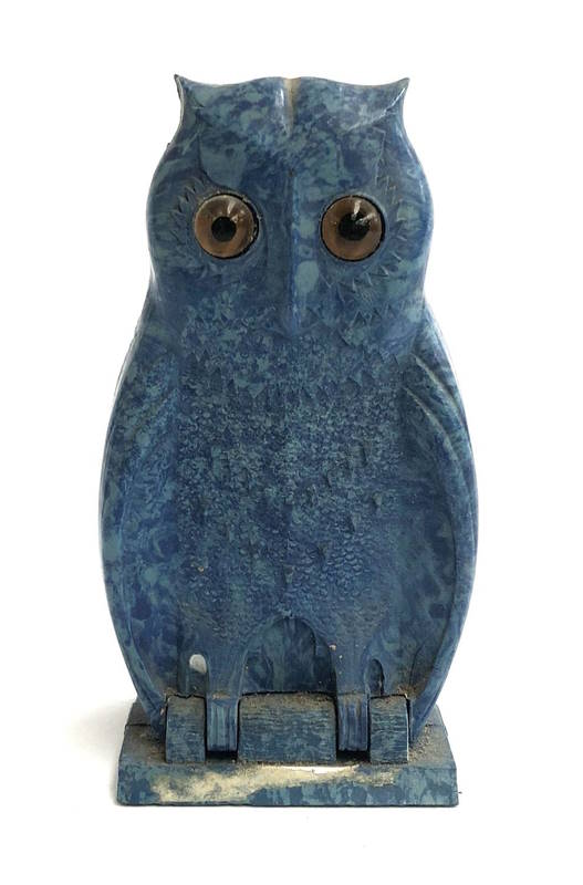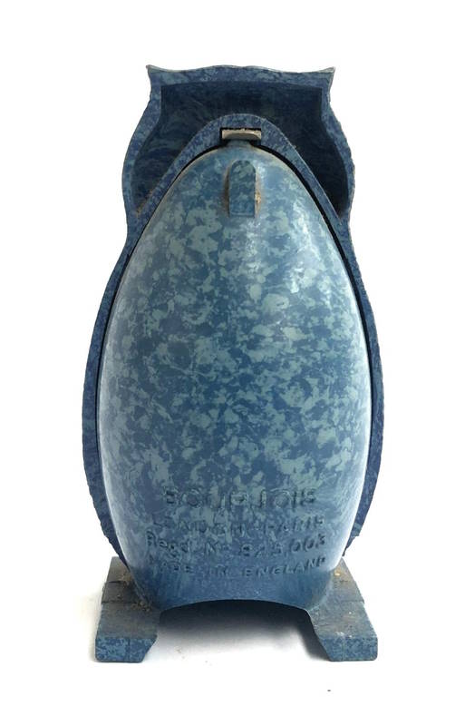 The owl, traditionally associated with wisdom and mystery, was a delightful metaphor for the allure of Paris after dark. Its wise gaze seemingly hinted at the unseen stories that unfold on the cobbled streets of the City of Light – maybe. The owl holder is a mottled blue colour, with inset eyes, opening to reveal the space for the bottle. It measures about 9.5cm in height.