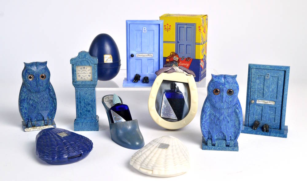 A collection of 1940s An Evening in Paris by Bourjois Bakelite novelties. Including including boxed “Hotel Door”, and unboxed “Hotel Door”, owl, longcase clock, slipper, lucky horseshoe, egg, and scallop shells in both blue and white. Sold for £200 at Anderson and Garland, May 2023.