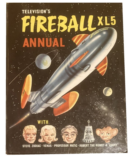 Cover showing the Fireball XL5, and the main crew Steve Zodiac, Venus, Professor Matic, Robert the Robot, and Zoony.