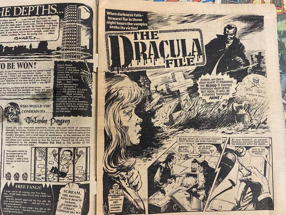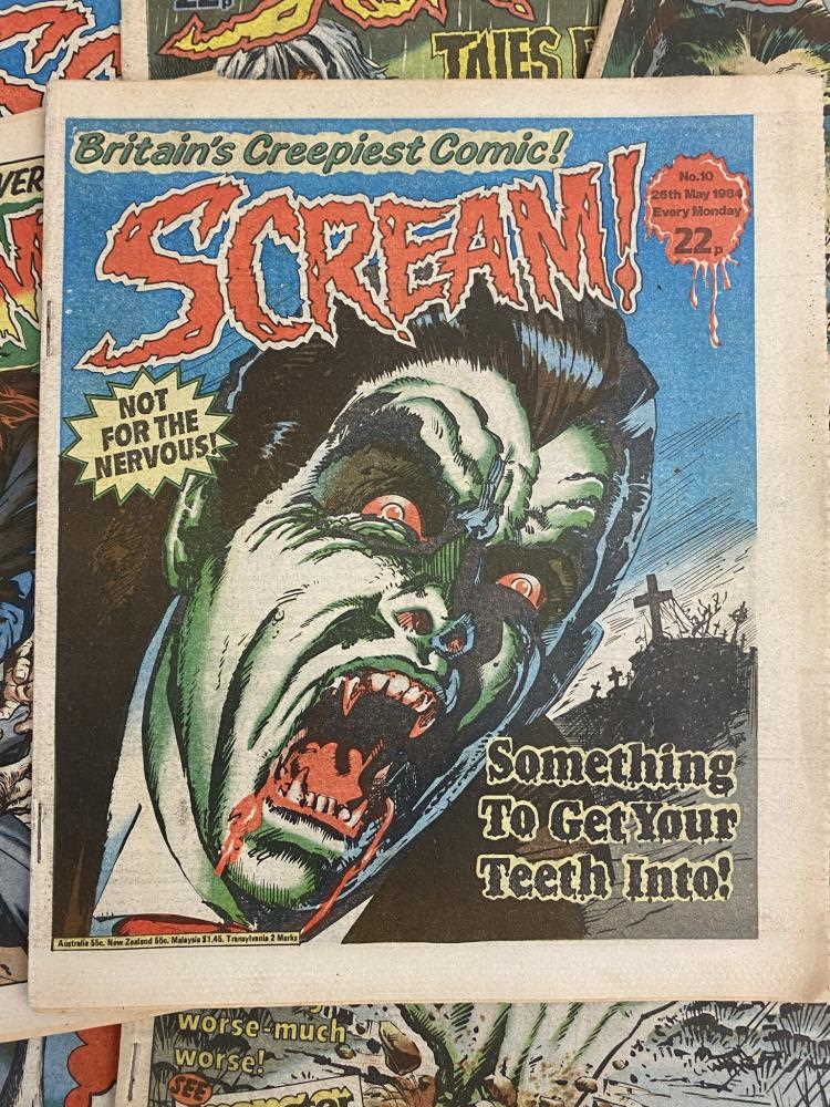 Scream! was a short lived (well in its own format) British weekly horror comic anthology that was published for 15 issues by IPC Magazines in 1984. It featured a number of horror related strips including: The Dracula File, The Thirteenth Floor, Fiends and Neighbours, A Ghastly Tale, Library of Death and Monster.