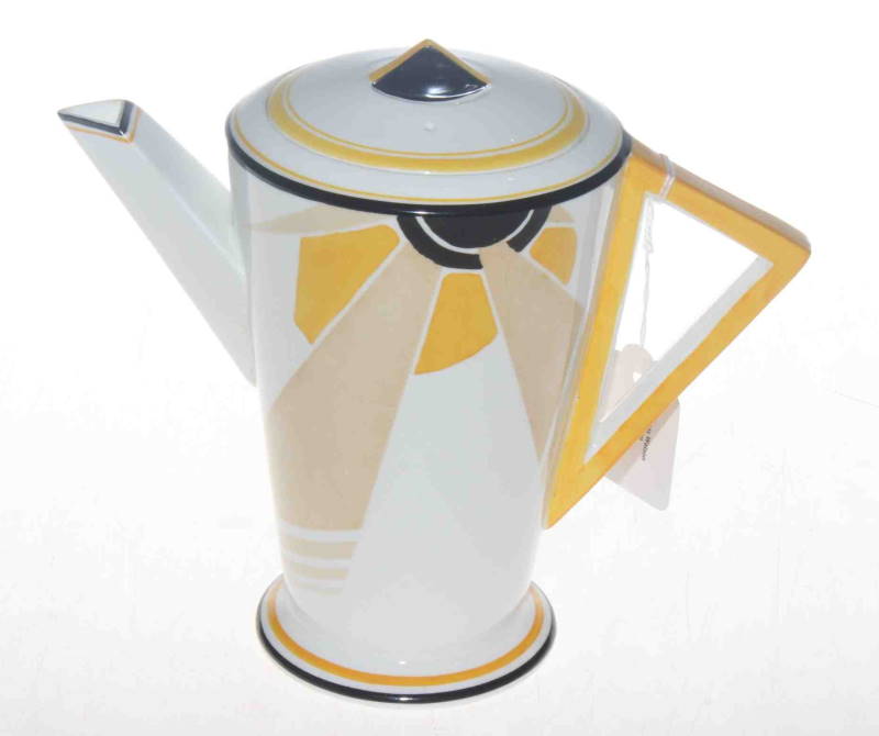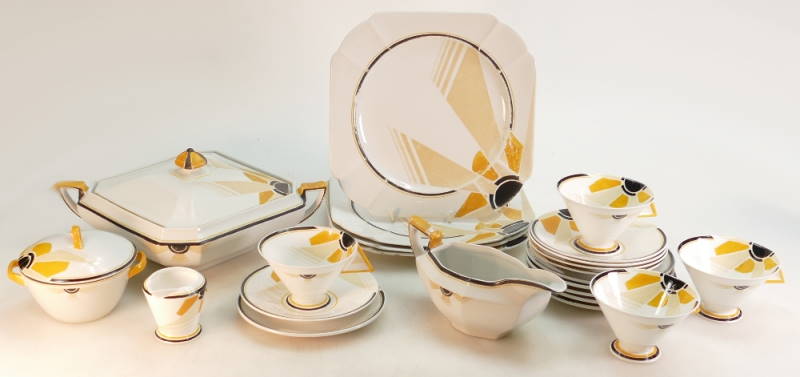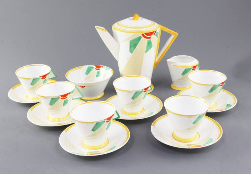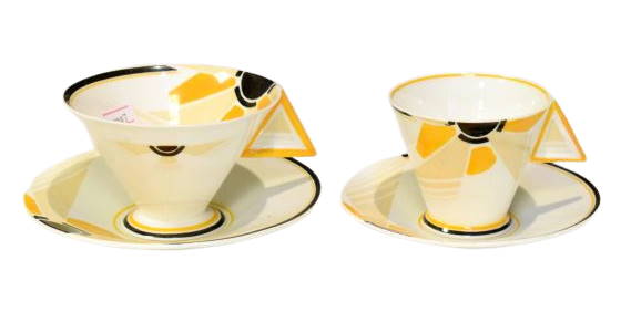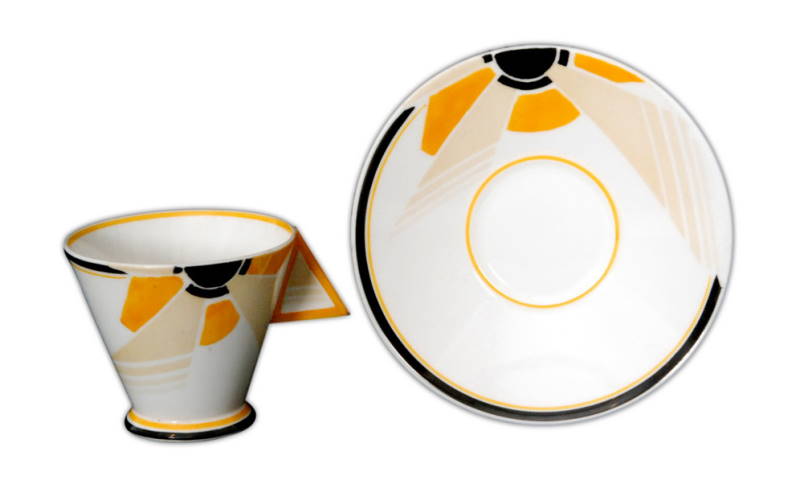 The most valuable of the Shelley designs are their futuristic designs of the late 1920s and early 1930s featuring strong colours such as the striking yellows of the Shelley Sunray pattern. The Sunray pattern featured on the Mode and Vogue shapes which are strongly influenced by the Art Deco movement with its streamlined geometric shape. The design was created by Shelley’s lead designer Eric Slater in 1930.