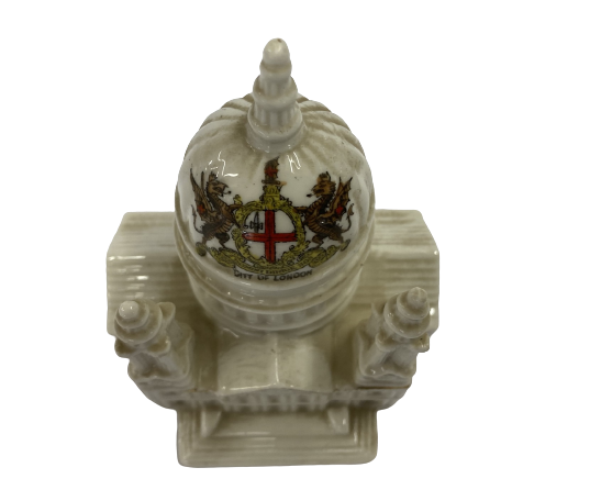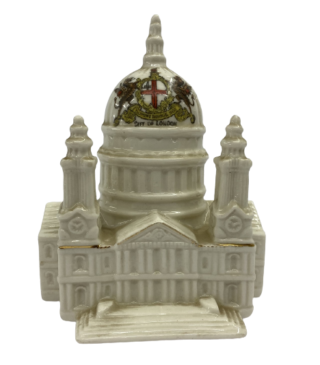 Crested China were a popular souvenir in the late 19th century and the early part of the 20th century. They were typically bought on holidays or day-trips especially from seaside locations, cities and tourist centres. There were a number of factories producing crested china including Arcadian who produced this great model of St Pauls Cathedral which has the City of London crest. Similar models can be found by other factories, with other crests and in smaller sizes.